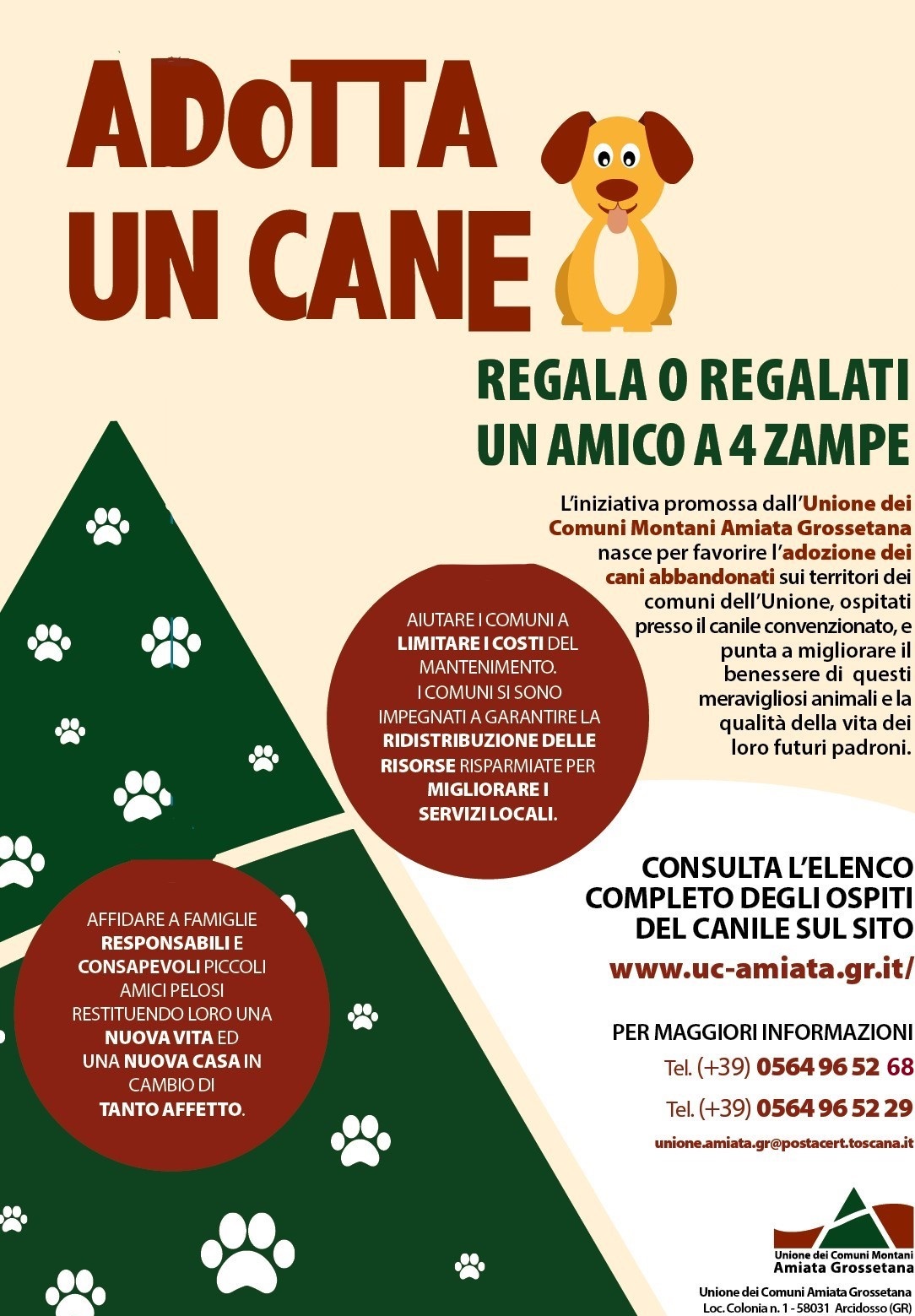 “Adotta un cane –Regala o regalati un amico a 4 zampe” è una campagna di sensibilizzazione nei confronti del tema del randagismo promossa dall'Unione dei Comuni Montani Amiata Grossetana, al fine di favorire l'adozione, non solo dei cittadini amiatini ma di chiunque, dei cani abbandonati sui territori dei comuni facenti parti dell'Unione stessa e ospitati presso il canile convenzionato. L'iniziativa nasce dall'esigenza di migliorare il benessere di questi meravigliosi animali da compagnia e la qualità della vita dei loro futuri padroni.